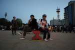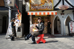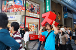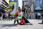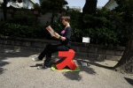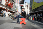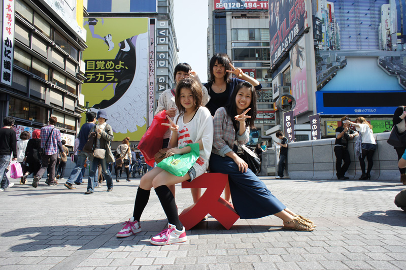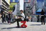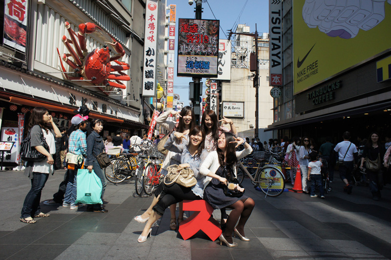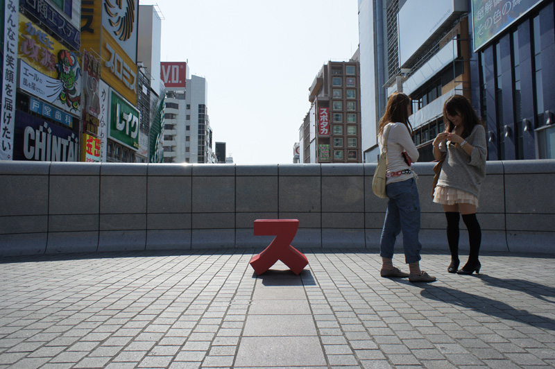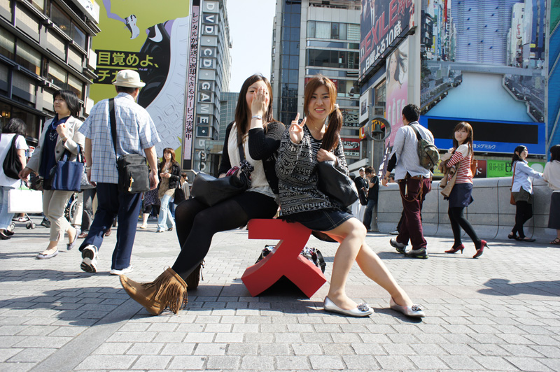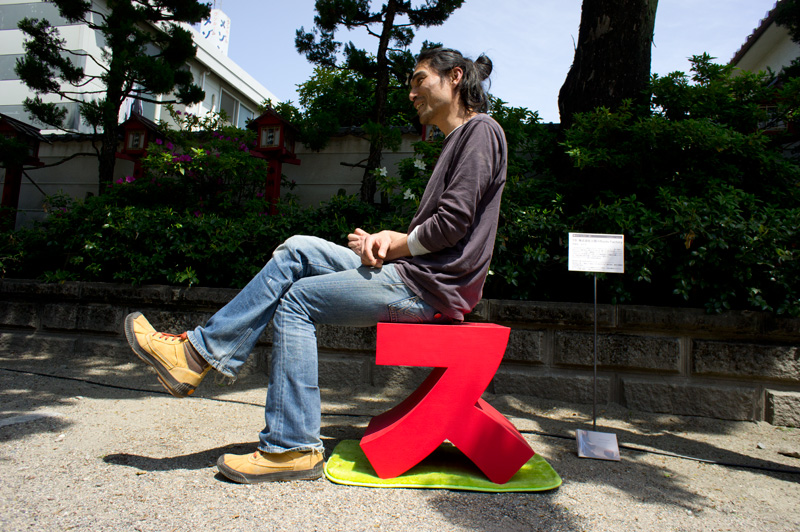 そうこうしているうちに、勢い余って道頓堀へ。大阪に観光に来た人たちや、スイスに興味を示した人に座っていただきました。